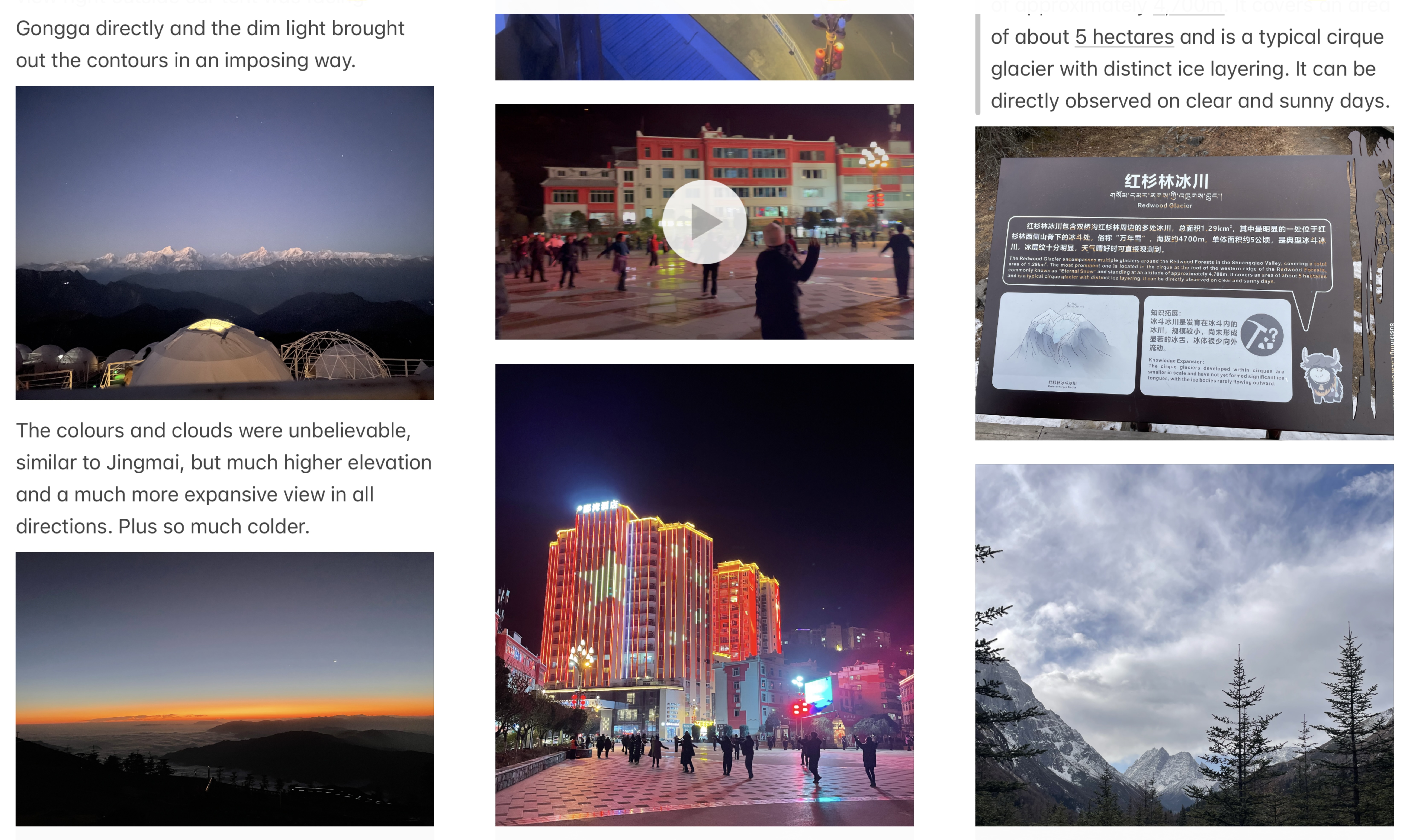 More example screenshots of my daily travel journal notes. Photos are from Niubeishan Mountain in the Luding County, Sichuan; Xiaojin County, Sichuan; Mt. Siguniang in the Ngawa Tibetan and Qiang Autonomous Prefecture, Sichuan; Pu’er, Yunnan, and; Xindu District of Chengdu.