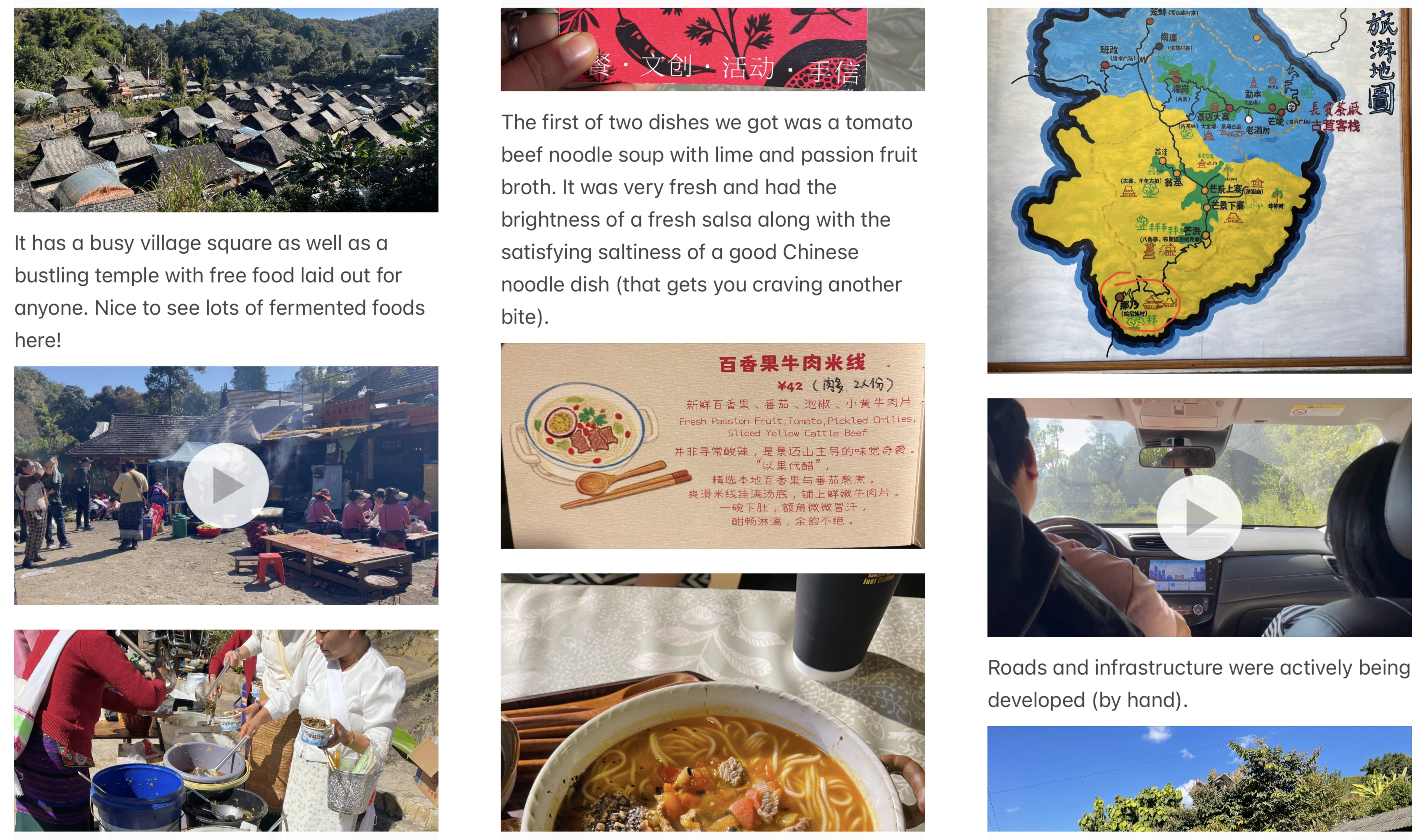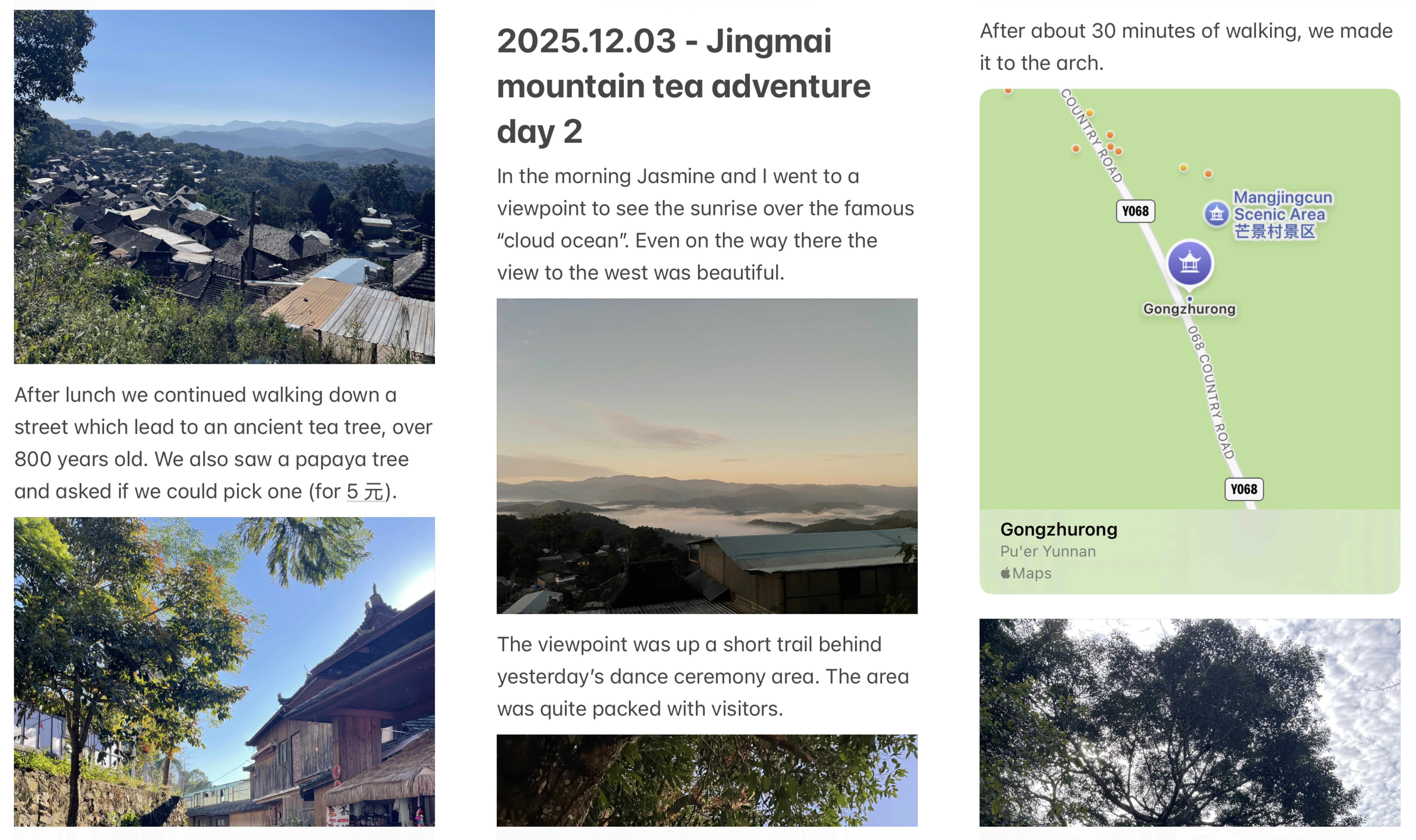 Example screenshots of my daily travel journal notes. Photos are from Jingmai Mountain in the Lancang Lahu Autonomous County, Yunnan, China.