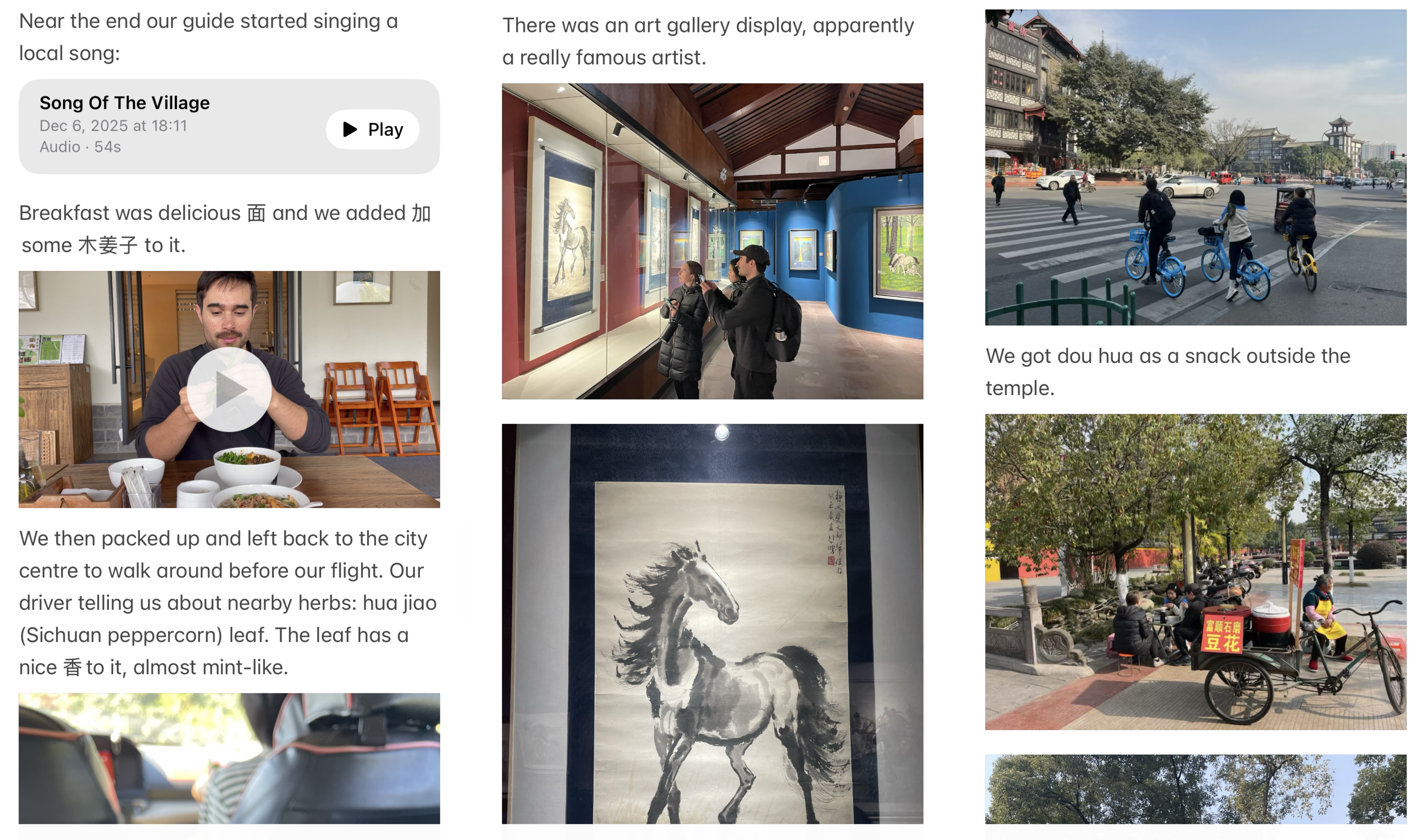 As each day unfolded, I would jot down observations, drop in select photos & videos, capture the occasional audio recording of an interesting sound (nature, singing, etc), embed point-of-interest locations from my maps app, and paste in links and excerpts from websites related to my experiences. Whenever I had larger blocks of free time (maybe during a break or before bed) I’d fill in key details and ultimately craft the note into a readable, personal and narrative-driven artifact.